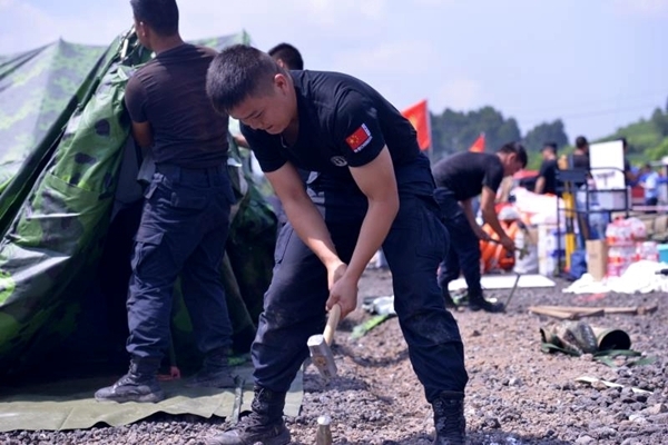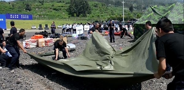 27日是集结演练,全州17县市参演单位在演练区域开展装备物资展示及搭设帐篷技能比赛,而现场裁判员则根据各支队伍完成帐篷搭设的时间、所携带救援物资的数量和完整度以及帐篷周边设施是否齐备进行打分。