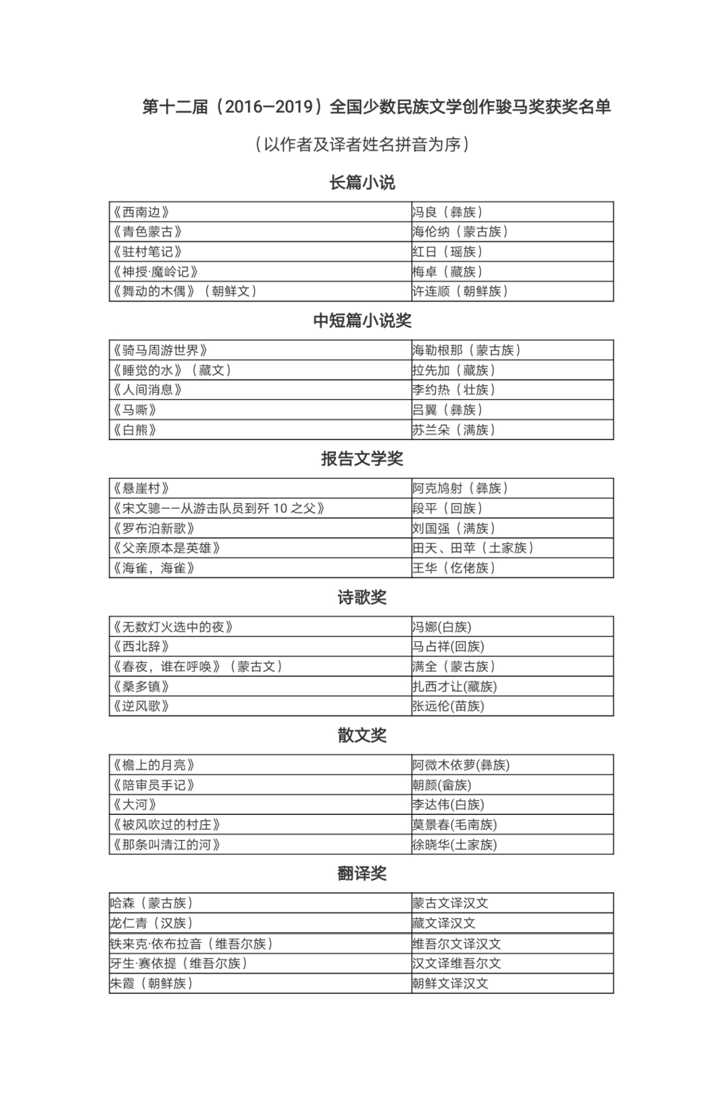 附:第十二届(2016—2019)全国少数民族文学创作骏马奖获奖名单