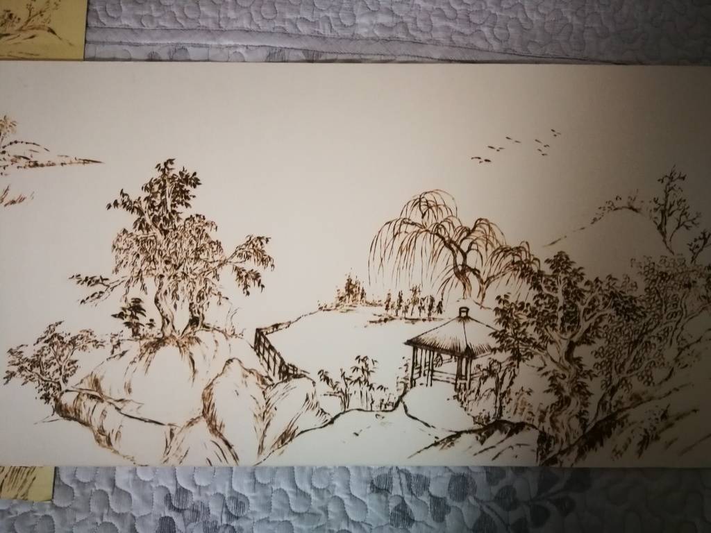 高崇秀的火绘作品大都以山水为主题,深浅不一的褐色中透着古朴的韵味,有些作品上还附上了自己所作的诗词。每一幅画都表达了她对文艺的热爱、对生命的感悟、对自然的崇敬。