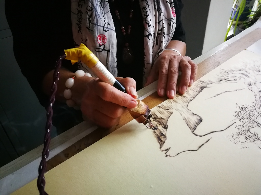 走进高崇秀的家中,干净整洁的家居环境极具艺术气息,书法、国画、火绘作品被装裱起来挂在墙上,茶具摆放得整整齐齐。在工作间,她正在使用自己改进的烙画笔在纸上创作着一幅新作品。