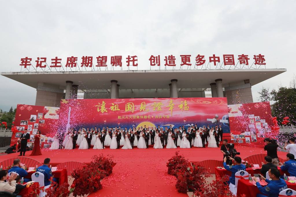 北斗作证,嫦娥为媒。2020年10月1日,西昌卫星发射中心西昌会场为37对航天新人举办“让祖国见证幸福”集体婚礼。