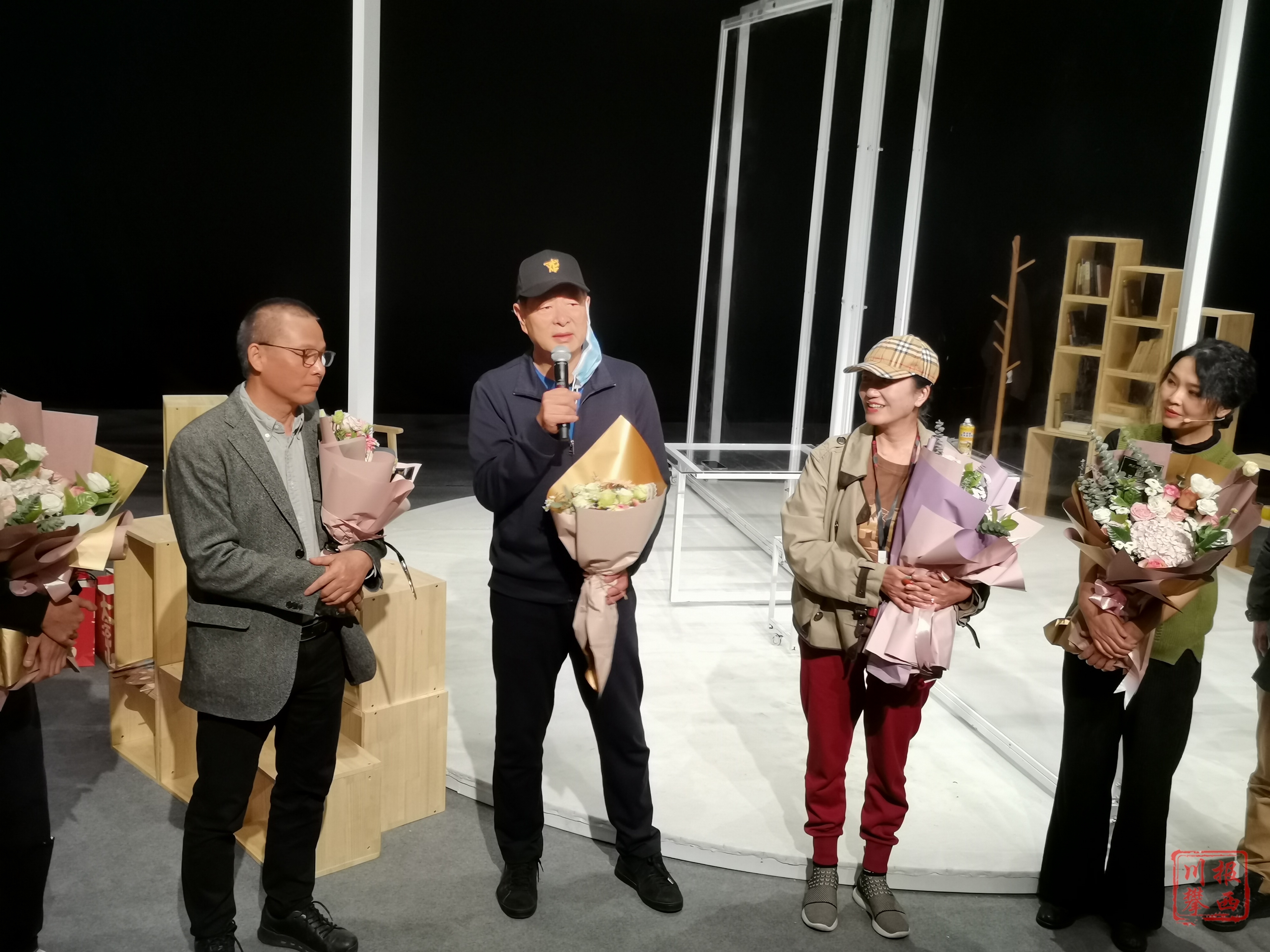 演出结束后,濮存昕应邀上台,摘下口罩与《隔离》主创人员及男女主角合影留念,并谈了对该剧的观感。