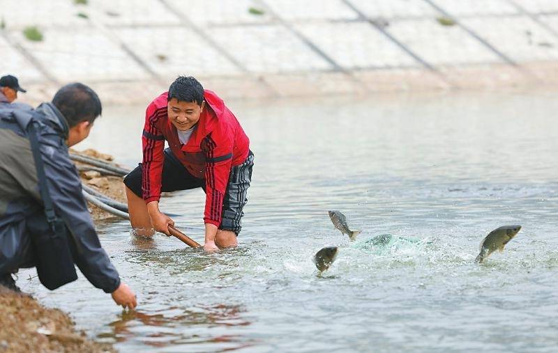 30亩的水面上,4台增氧机轰鸣。村民在岸边撒下饲料,让鱼群聚集起来,“早就等着这一天。”村民邵曲惹甩起手里的网兜,将其切入水面,然后捞出一网鱼。“大的鲤鱼,小的鲫鱼,还有花鲢、白鲢、草鱼,我们把超过一斤的鱼捞上来,小鱼放回去。”邵曲惹说,这是红旗水库生态养鱼项目第一次捕捞,两天要捕5万斤鱼,“卖了大家都有钱分。”