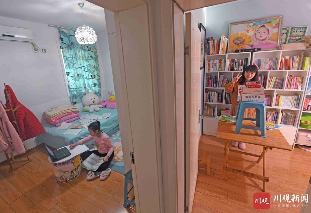 2月18日,成都市晋阳小学四年级学生张芷萱(左)在家中通过学校“云端”课程,进行文化课学习;一旁,她的妈妈张静,成都市行知实验小学教师,正在录制相关网上教学视频。四川在线记者 肖雨杨 摄