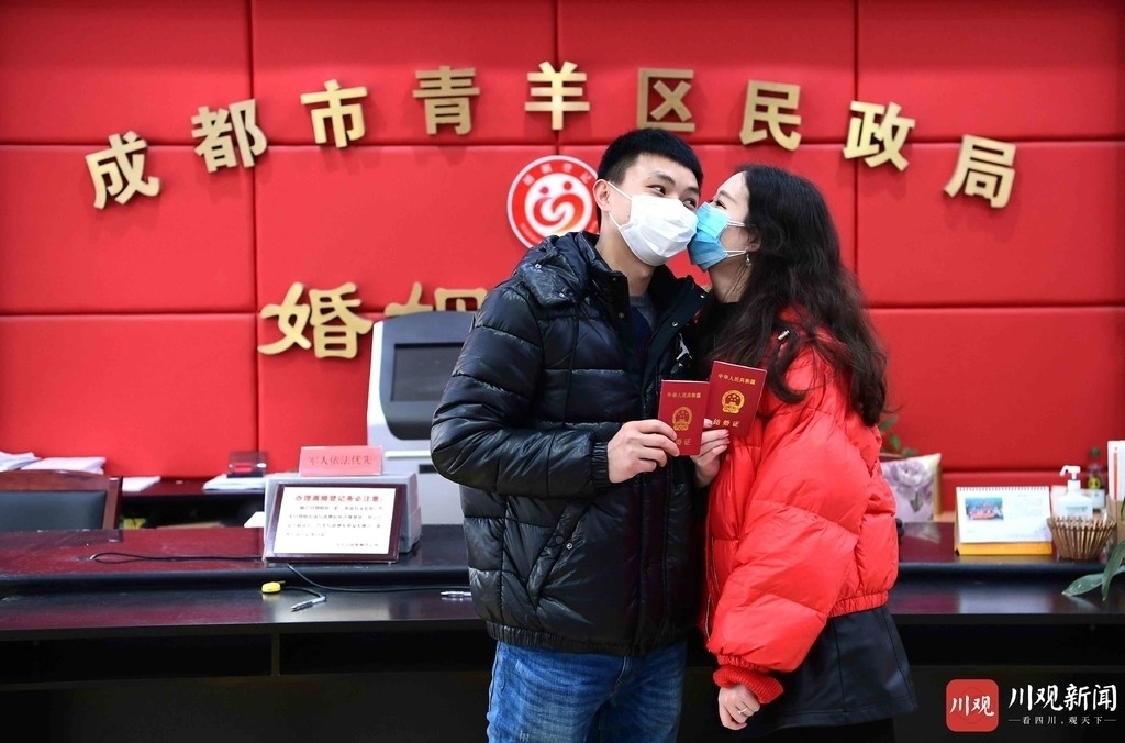 2月5日,成都市青羊区结婚登记处,领到结婚证的小两口一起留影。从3日起,成都市各婚姻登记处已经正式上班。为了减少交叉感染,成都市各婚姻登记处实行预约限号。四川在线记者 何海洋 摄
