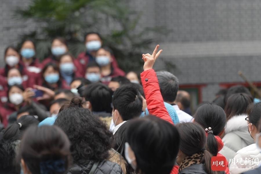 2月7日,人群中有家属举起“胜利”的手势,为队员加油。