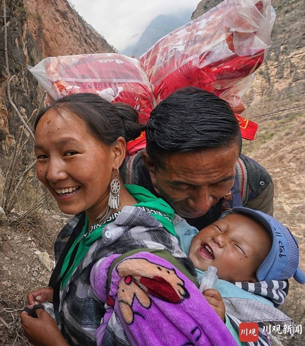 5月13日,凉山州昭觉县支尔莫乡阿土列尔村(“悬崖村”)的31户贫困老乡,采取“人走钢梯、行李走索道”的方式下山,在山脚集中乘车,进县城、领钥匙、搬新家。图为下山后,村民某色达体亲吻小孙子。四川在线记者 尹钢 摄
