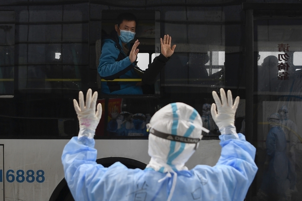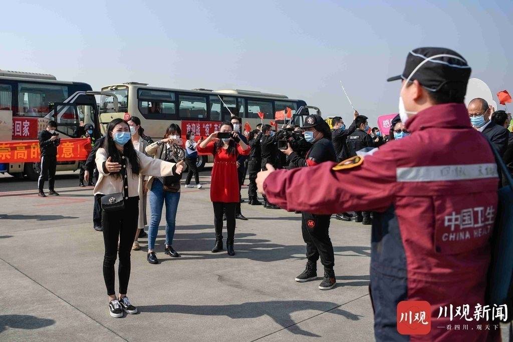 3月6日下午3点50分左右,武汉汉阳方舱医院患者出舱转院与医护人员挥手作别。四川在线记者 杨树 摄