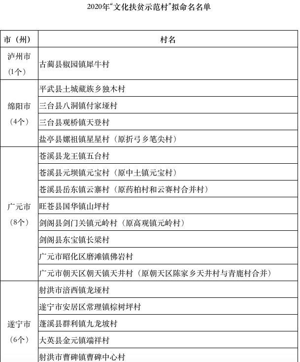 12月25日,记者从四川省农业农村厅获悉,日前,经过县(区)申报、市(州)推荐、创建活动成员单位联合开展资料评审和实地抽查,拟命名古蔺县椒园镇犀牛村等124个村为四川省2020年“文化扶贫示范村”(名单附后),公示时间为2020年12月25日至12月27日。