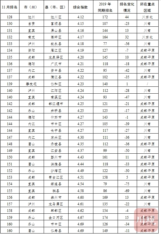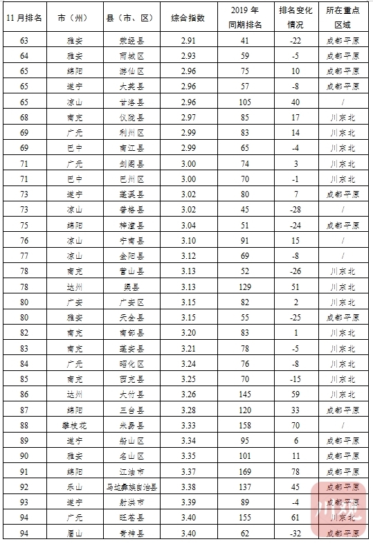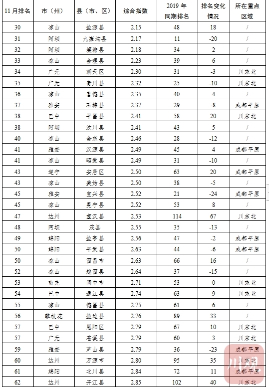 12月29日,四川在线记者从四川省污染防治攻坚战领导小组办公室获悉,今年11月四川省183个县(市、区)城市环境空气质量排名结果出炉,在这份“榜单”中,哪些县(市、区)空气质量排名前十?哪些空气质量下滑?一起来看看吧!