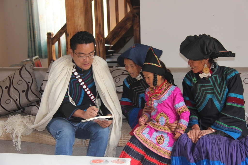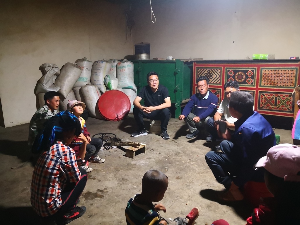 罗雅宏(左一)在谷莫村贫困群众家中和群众一起算“收支账”,作“明白人”