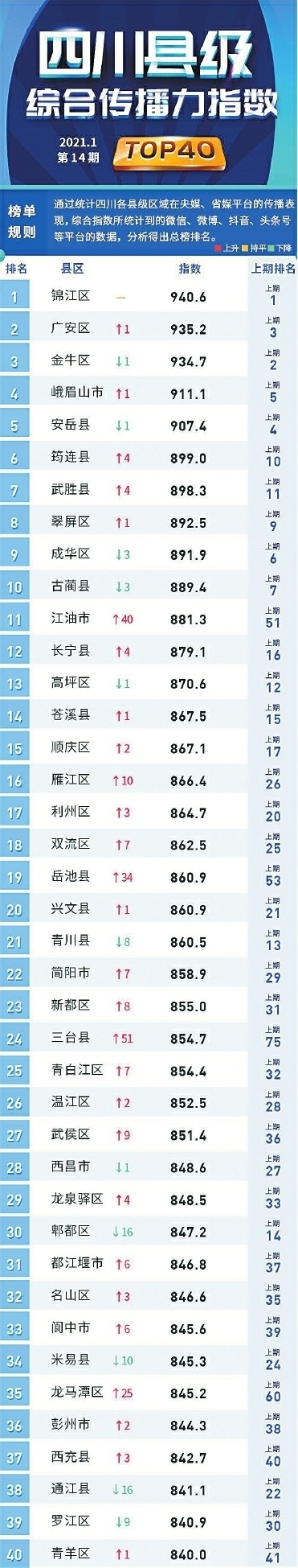 本期综合传播力指数前40名中,成都市锦江区蝉联第一,广安市广安区、成都市金牛区、乐山市峨眉山市、资阳市安岳县进入前五;绵阳市三台县、江油市,广安市岳池县,泸州市龙马潭区排名上升幅度大;除成都外,南充市、宜宾市均有4个县(市、区)入围前40名。
