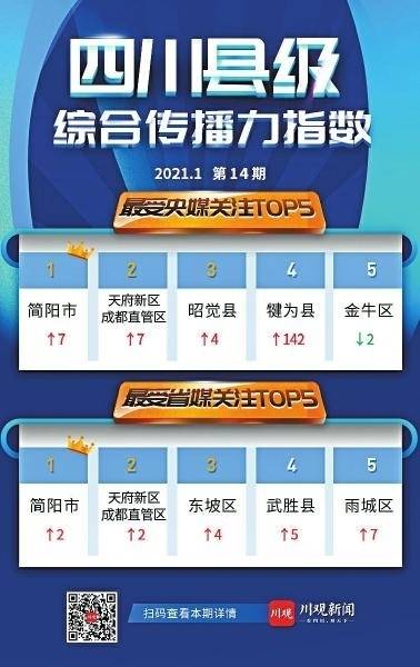 省媒关注榜中,成都市简阳市、天府新区成都直管区、眉山市东坡区、广安市武胜县、雅安市雨城区名列前5名。武胜县的关注热度,主要来自于民警熊中华当选2020全国“最美基层民警”;雨城区的四川国际赛事中心封顶、“最美红豆树”上榜“四川十大树王”等新闻被多家省媒报道。