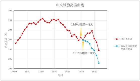 3月24日的山火监测预警试验中,大陆灾害预警网通过卫星监测到了山火试验点温度的明显上升。