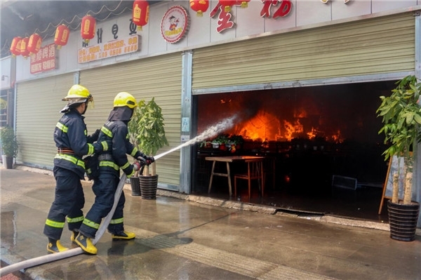 12时47分,消防救援力量到达现场,火势正处于猛烈燃烧阶段,经询问得知,烧烤店内还存有液化气罐,情况十分危急。根据现场情况,现场指挥员立即组织指战员进行火情侦查,并在着火区域东西两侧分别架设水枪、水炮对火势形成两面夹击的阵势,同时设立警戒区域并对周边群众进行疏散。