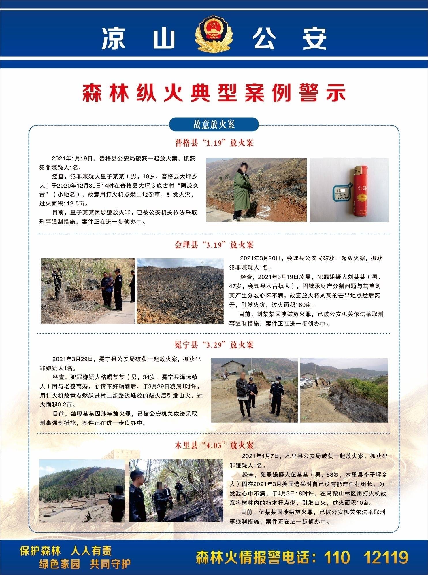 发布会展示了《关于依法惩治森林草原纵火(失火)违法犯罪行为的通告》,通报公安机关开展反森林草原纵火(失火)违法犯罪行为工作打算,并通报了州内十起违规野外用火警示典型案例。据了解,根据专项行动的安排部署,凉山州公安局将加大巡查力度,加强打击力度,以零容忍态度严厉打击森林草原纵火、违规野外用火的违法犯罪行为。
