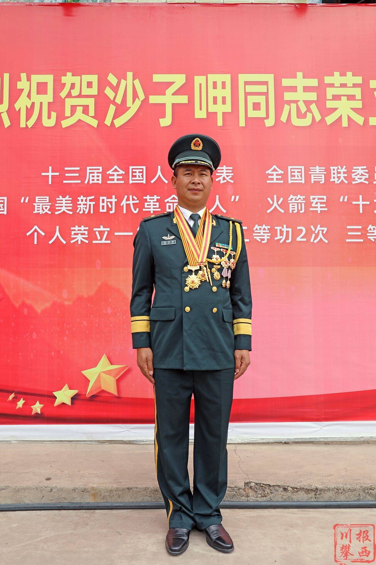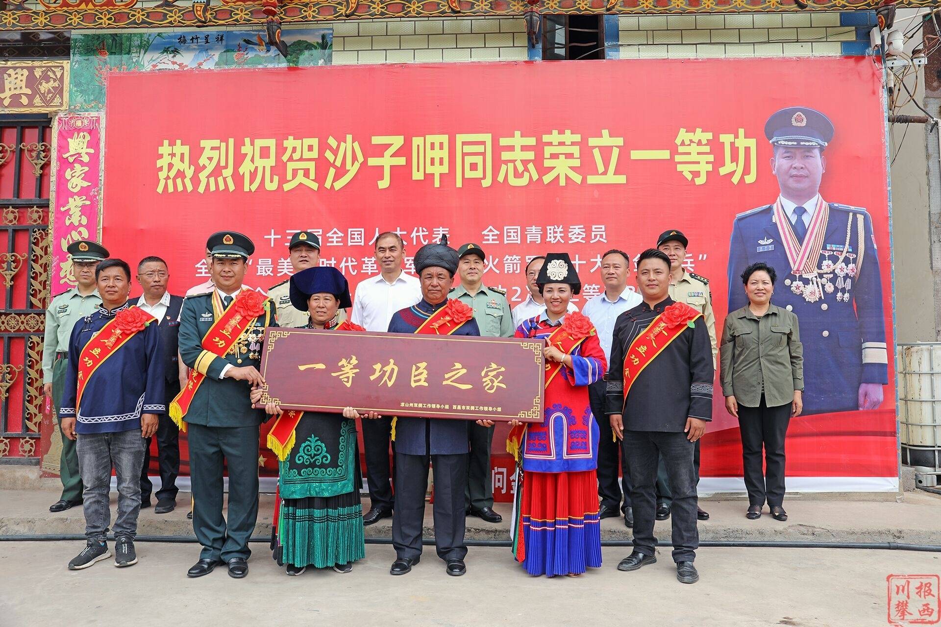 5月19日,荣立一等功的火箭军某旅工程营营长沙子呷在军地领导、父老乡亲的陪同下,带着功臣之家牌匾、一等功喜报,载誉返乡。