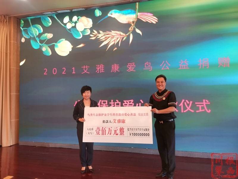 为庆祝中国共产党成立100周年,促进西昌市生态环境保护、巩固脱贫攻坚成果,推进乡村振兴,艾雅康决定将摄影作品拍卖所得的100万元和他本人精心拍摄的100幅/种精美鸟类摄影作品捐赠给西昌市,以此表达他对家乡的支持。