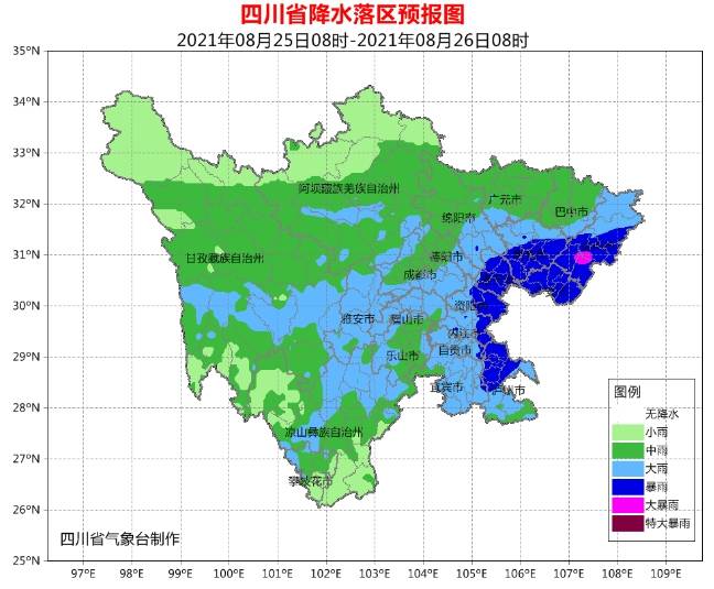 凉山州气象台也发布了暴雨蓝色预警:预计25日傍晚到26日白天,凉山州有一次强降雨天气过程,雨量普遍为中到大雨,其中西昌市、盐源县、德昌县、普格县、布拖县、昭觉县、喜德县、冕宁县、越西县、甘洛县、美姑县的部分乡镇有暴雨,个别乡镇有大暴雨,本次天气过程可能伴有短时强降水、雷暴、短时阵性大风等强对流天气。