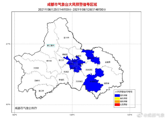 ▲ 成都市气象台8月25日14时00分发布大风蓝色预警信号:预计未来24小时,金牛区、成华区、武侯区、锦江区、青羊区、高新西区、高新南区、东部新区和青白江区的部分地方可能受大风影响,平均风力可达6级以上或者阵风7级以上。