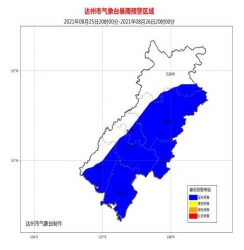 8月25日下午,达州市气象台发布暴雨蓝色预警:预计25日下午到26日白天,达州市有一次强降雨天气过程,万源、通川区、渠县以及宣汉、达川区两地西部大雨到暴雨(雨量20-60毫米),大竹、开江以及达川区、宣汉两地东部暴雨(雨量50-80毫米),局地降雨量超过100毫米,最大小时雨强20-50毫米。过程中伴有短时强降水、雷电、阵性大风等强对流天气。请各地注意防范强降水可能引发的中小河流洪水、山洪、城镇内涝和地质灾害。
