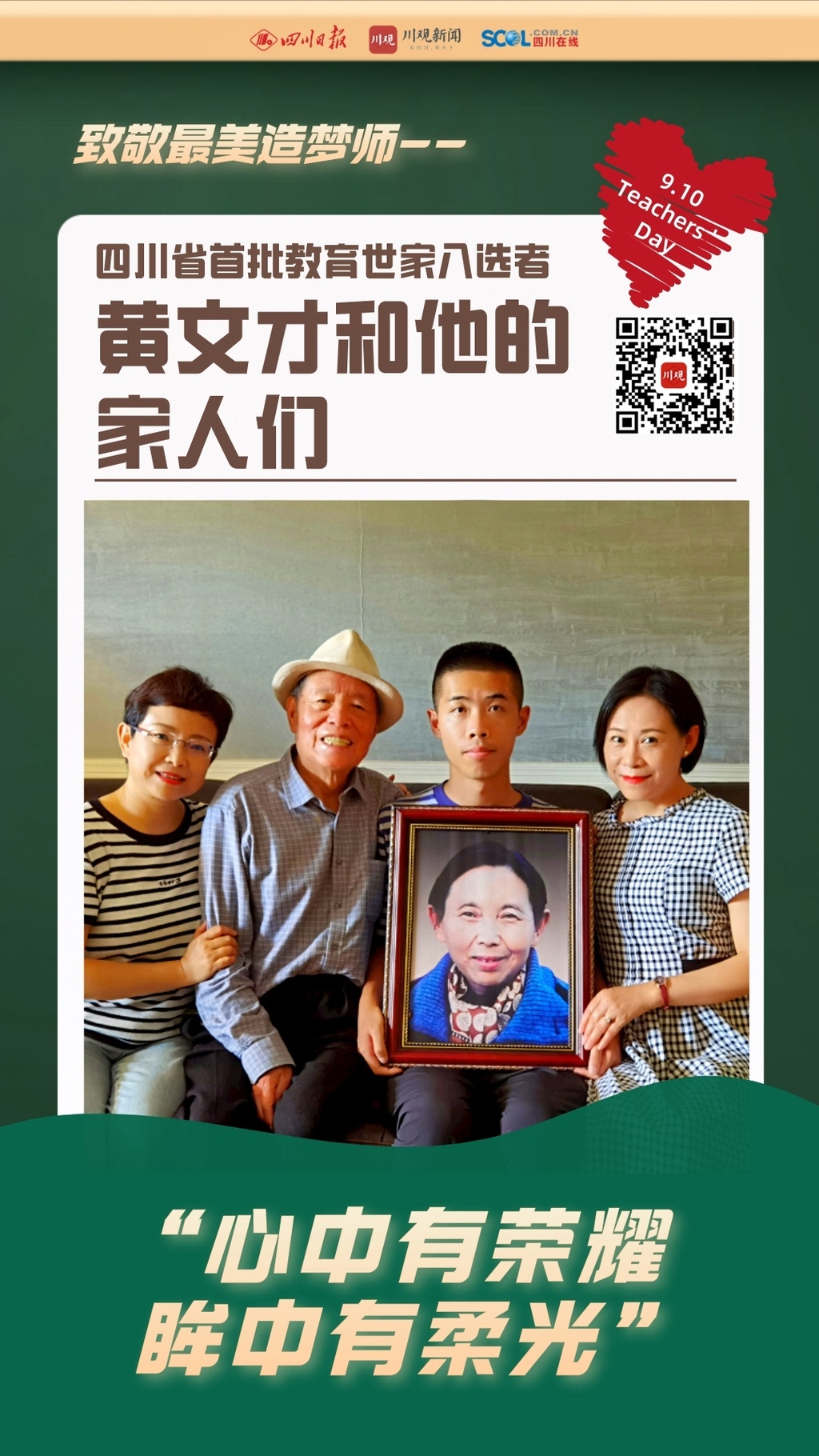 黄文才,现年81岁,小学美术教师,四川省首批特级教师、享受国务院政府津贴专家、四川省首批教育世家入选者。 黄文才妻子易淑萍,小学语文老师,已去世;黄文才大女儿黄涛, 中职礼仪高级教师 53岁,四川省优秀教师、凉山彝族自治州优秀班主任、西昌市教学能手;二女儿黄静、幼教老师、四川省特级教师、四川省首届幼儿骨干教师、四川省教学名师;外孙李盛锋,中学英语教师,曾获2019年凉山彝族自治州中职学校教师能力比赛二等奖。