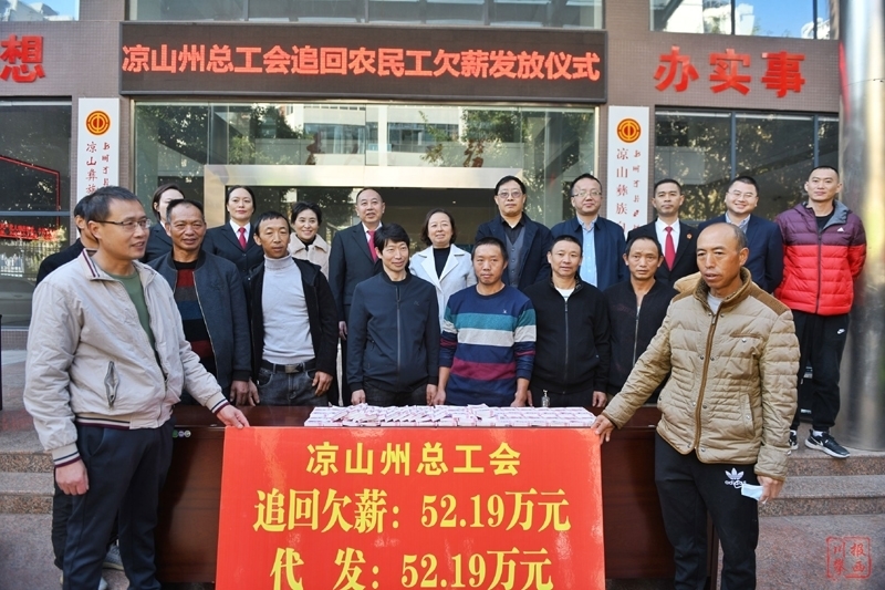 11月19日,是凉山彝历新年的前一天,凉山彝族自治州总工会联合凉山州中级人民法院、西昌市人民法院和四川月城律师事务所在凉山州总工会举行欠薪发放仪式,为84名农民工代发追回的欠薪521934.36元。