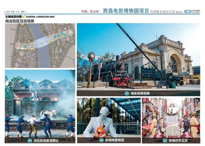 “两轴”即东边的东方星光大道和西边的西方星光大道,两条大道连通水上演艺中心,将整个博物馆群落横向连接。“五区”即整个博物馆群落初步分为凉山风情、激情岁月等五个区域,规划的17个博物馆有序分布在“五区”中。