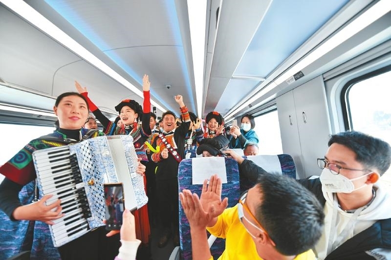 动车开进凉山当日,彝族群众在动车车厢内载歌载舞。