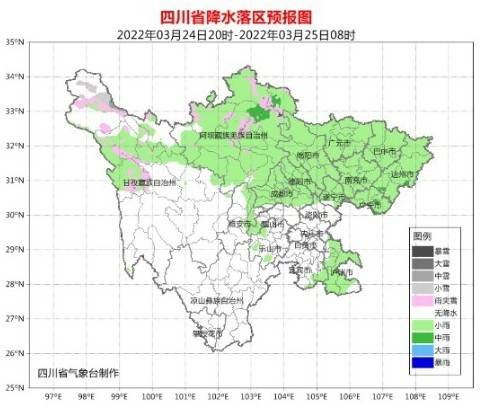 3月24日晚上,广元、绵阳、德阳、成都、巴中、达州、广安、南充、遂宁、泸州10市和雅安东部有小雨,盆地其余地方阴天;阿坝州大部、甘孜州北部阴天间多云有小雨(雪),其中阿坝州东部有中雨(雪),甘孜州其余地方和攀西地区多云间晴。