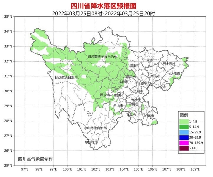 3月25日白天,盆地各市阴天转多云,西部沿山有分散小雨;阿坝州大部、甘孜州北部东部阴天间多云有小雨(雪),甘孜州其余地方和攀西地区多云间晴。
