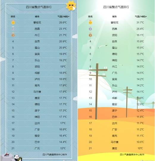 3月23日(左图)与3月22日(右图)四川各城市实况气温对比。