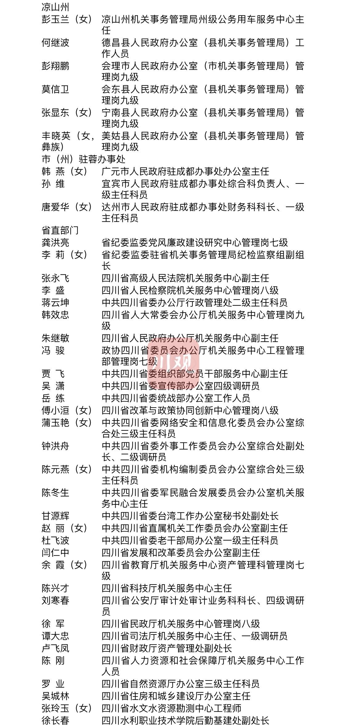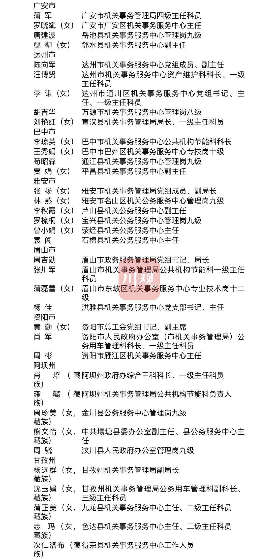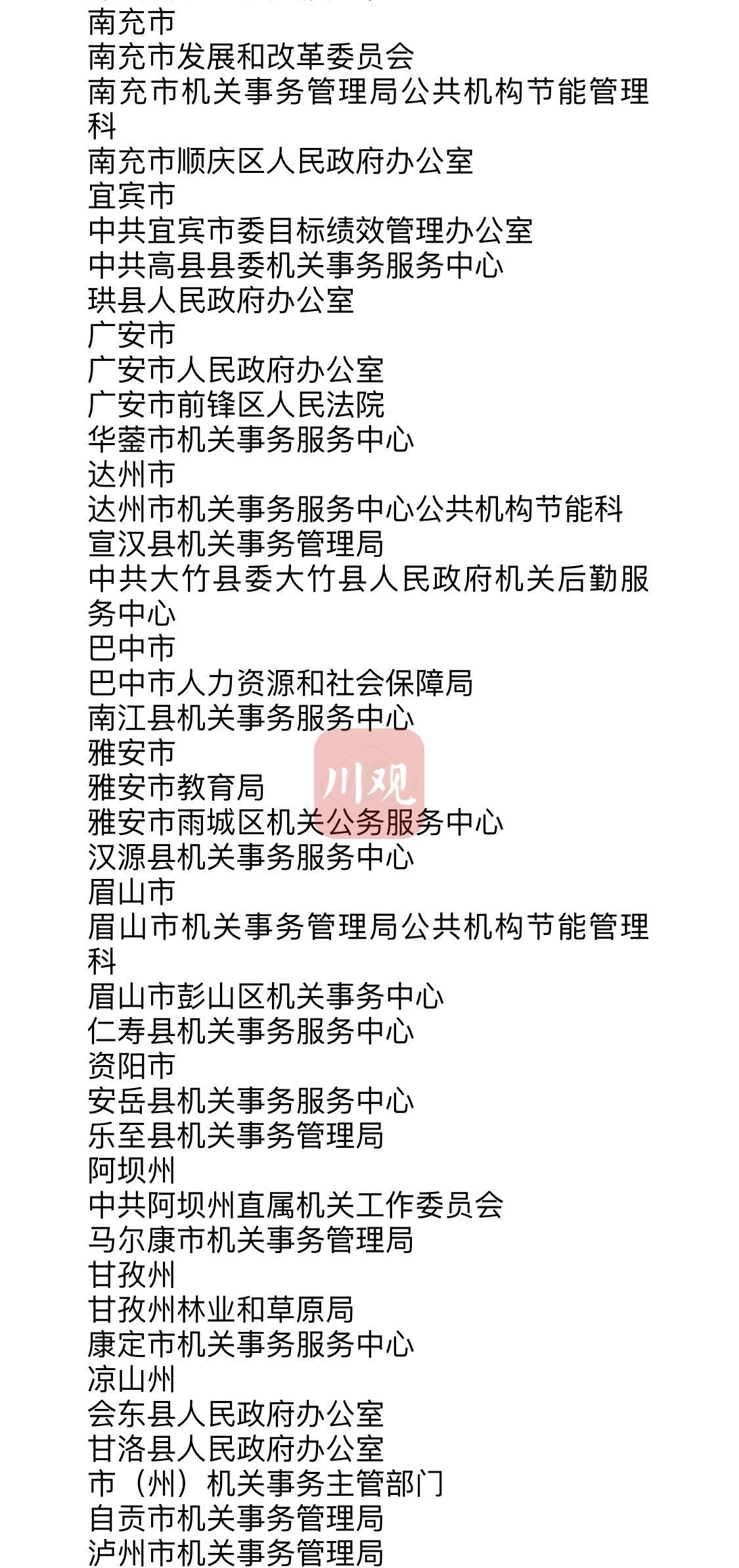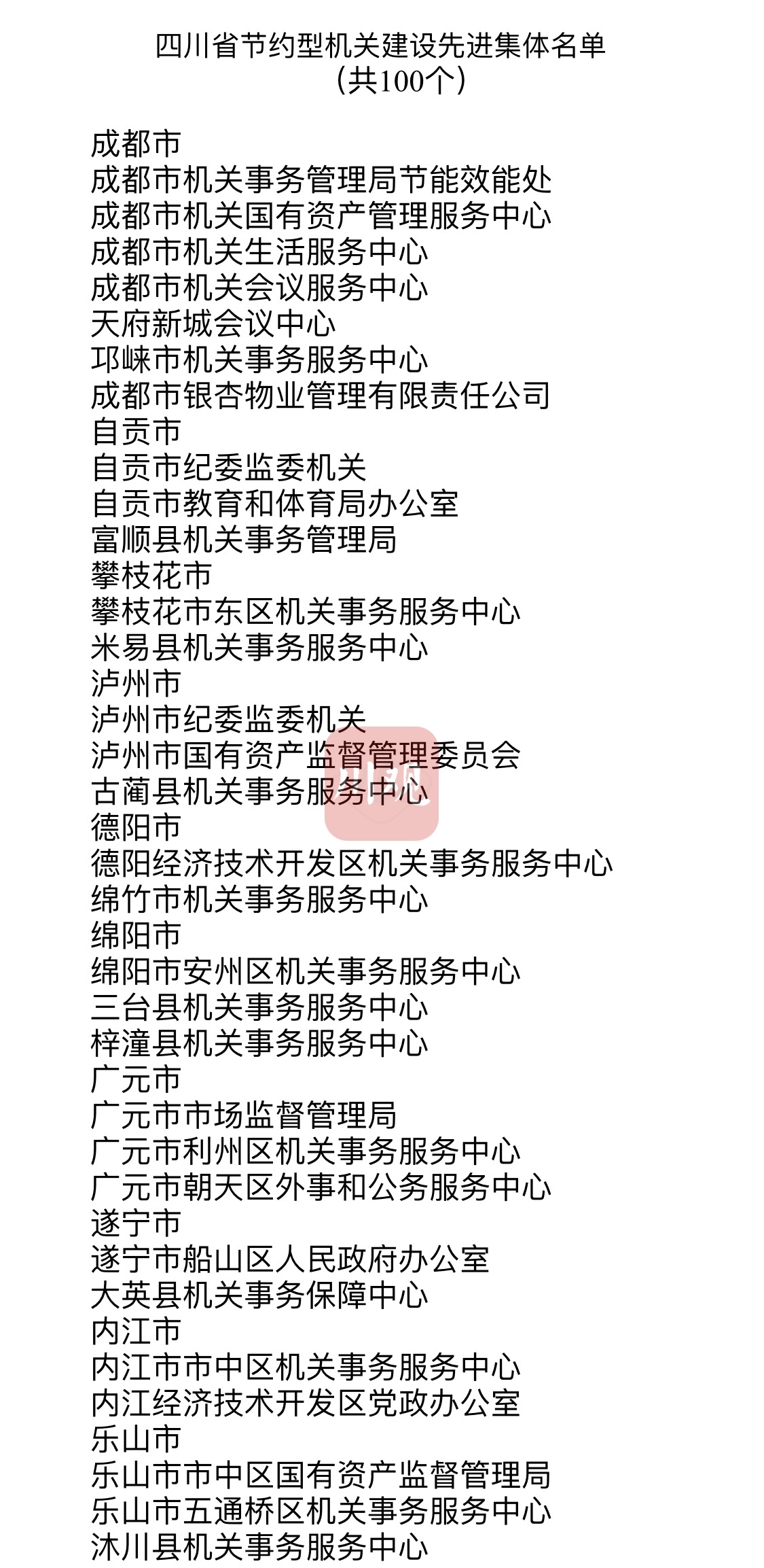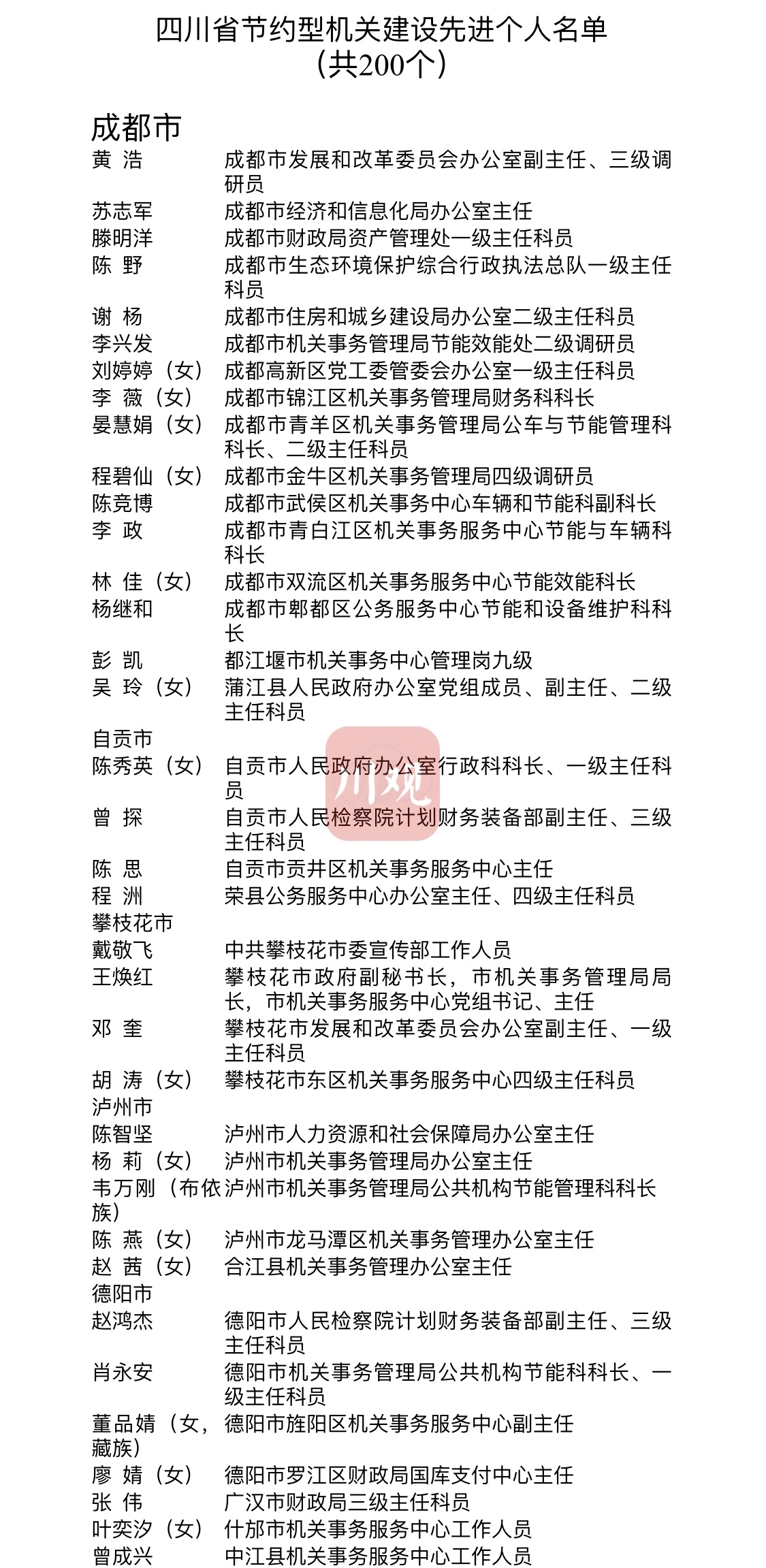 4月1日,记者从四川省机关事务管理局获悉,日前四川省机关事务管理局、四川省人力资源和社会保障厅决定,授予成都市机关事务管理局节能效能处等100个单位“四川省节约型机关建设先进集体”称号,授予黄浩等200名个人“四川省节约型机关建设先进个人”称号。