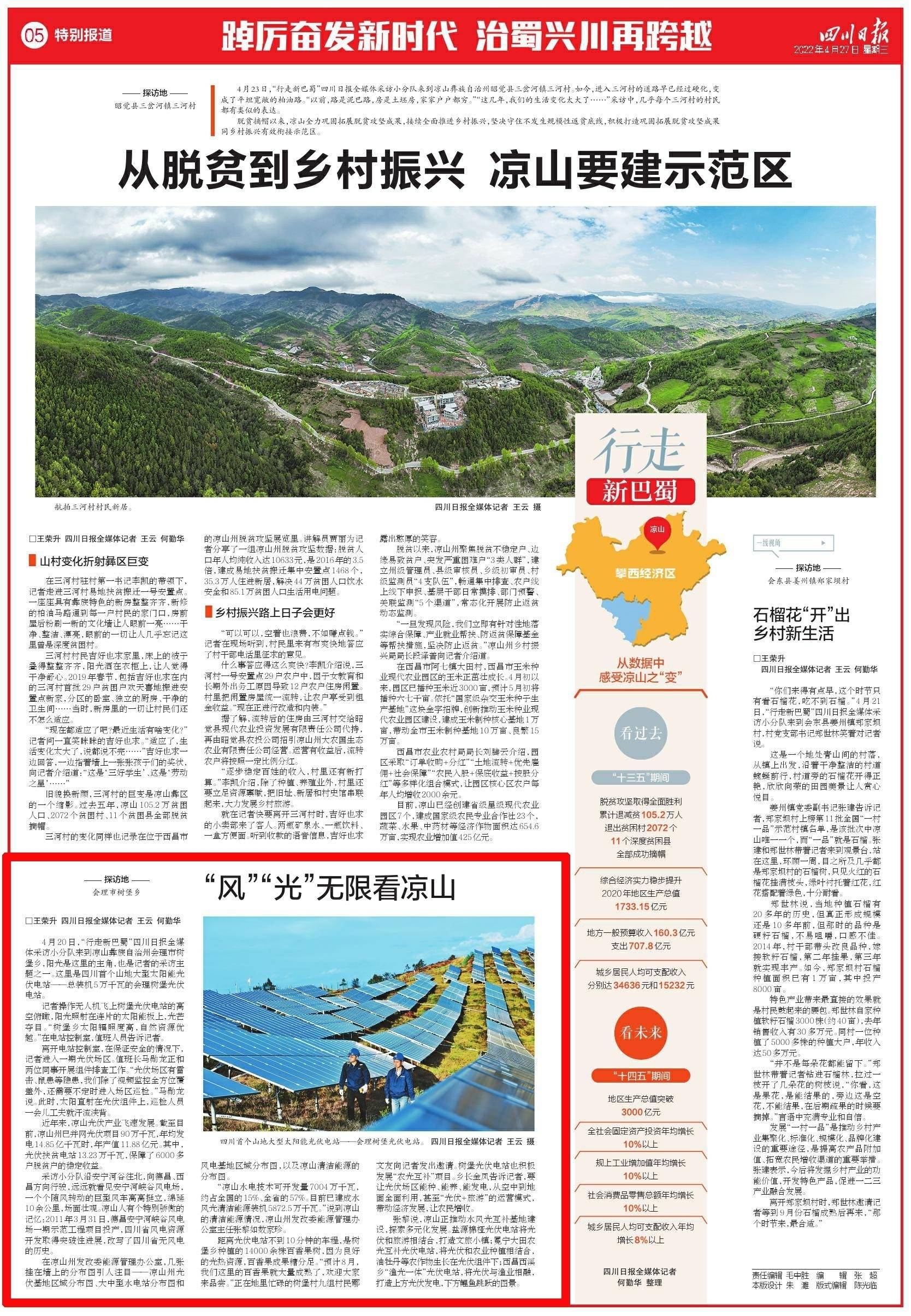 4月20日,“行走新巴蜀”四川日报全媒体采访小分队来到凉山彝族自治州会理市树堡乡,阳光是这里的主角,也是记者的采访主题之一。这里是四川首个山地大型太阳能光伏电站——总装机5万千瓦的会理树堡光伏电站。