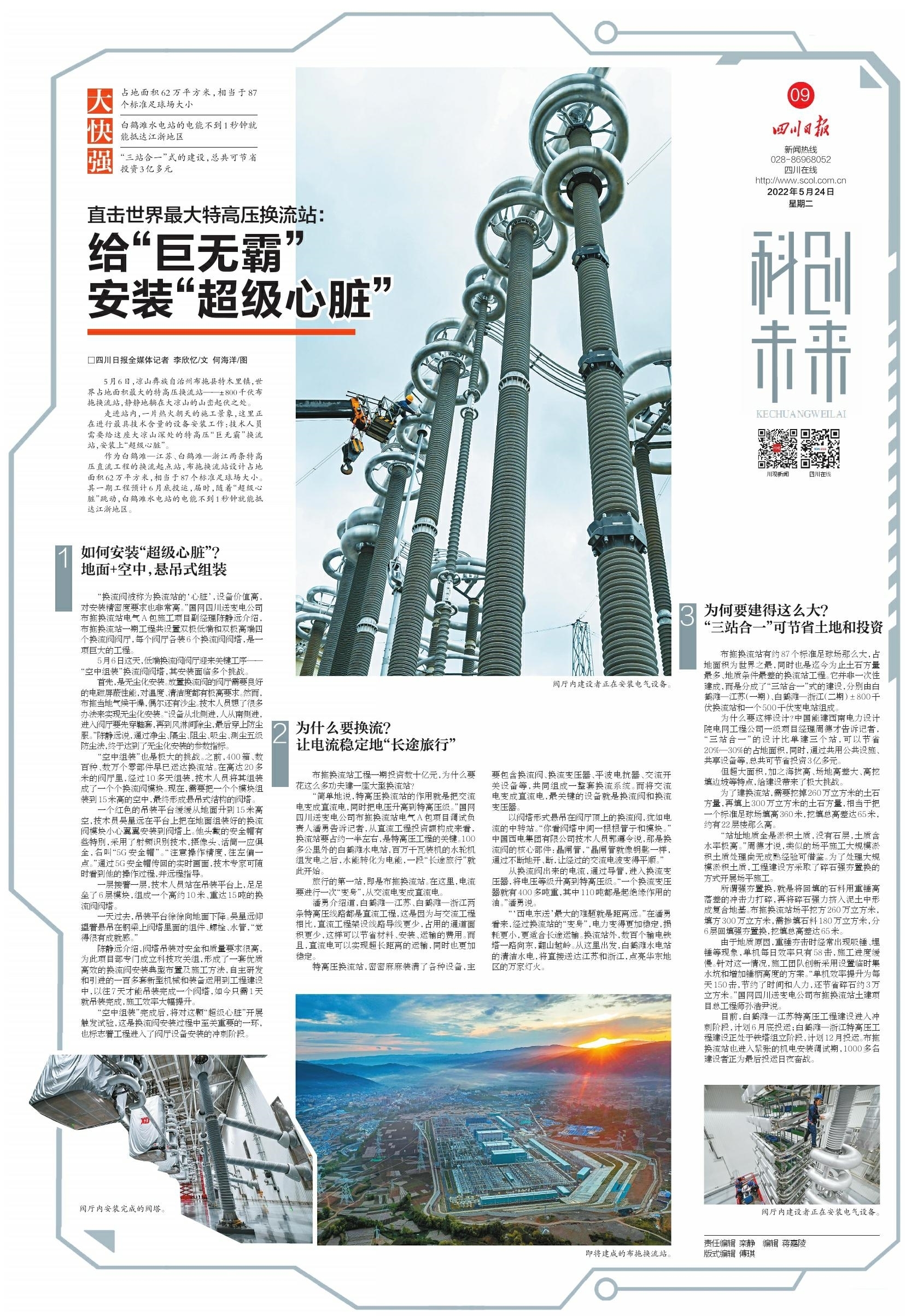 5月24日,《四川日报》9版刊发整版文章《直击世界最大特高压换流站:给“巨无霸”安装“超级心脏”》,关注位于凉山州布拖县特木里镇,世界占地面积最大的特高压换流站——± 800千伏布拖换流站,技术人员为其安装上“超级心脏”,为白鹤滩水电站电流稳定地“长途旅行”到江浙地区而奋战的故事。