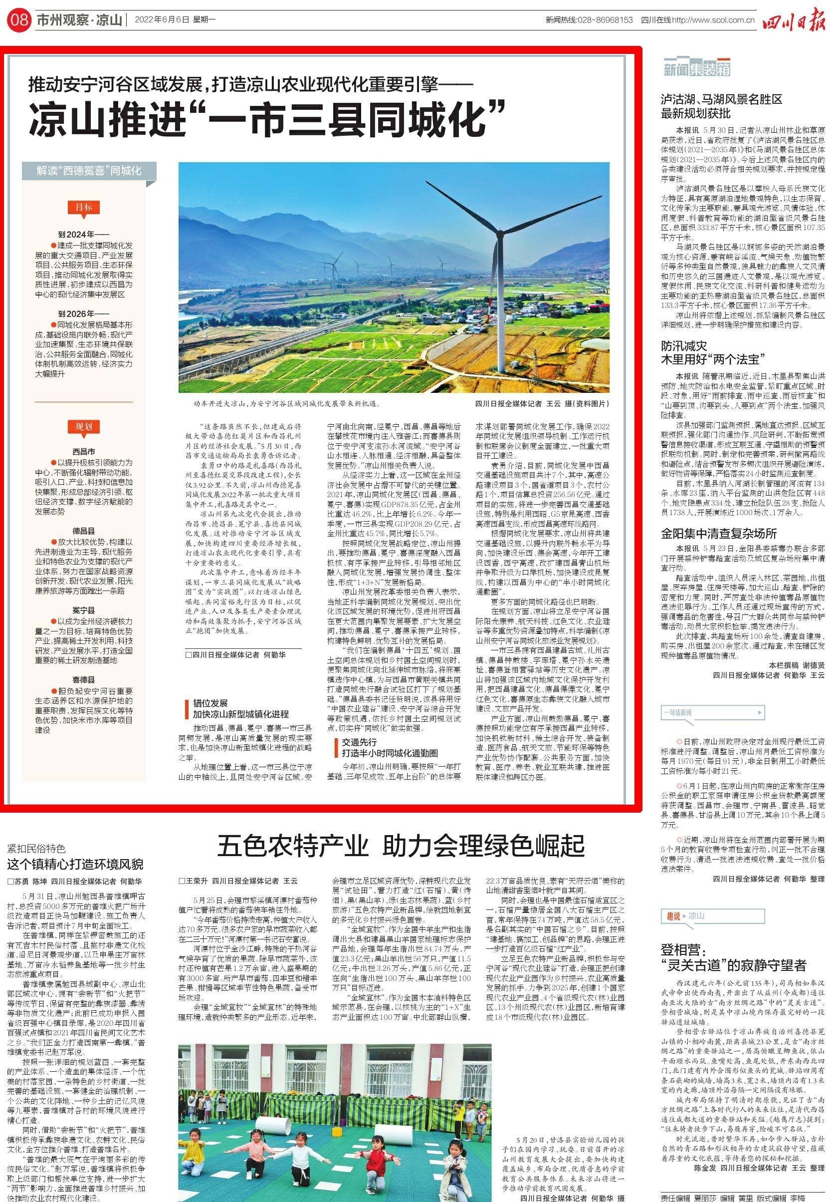 6月6日,《四川日报》8版刊发《推动安宁河谷区域发展,打造凉山农业现代化重要引擎——凉山推进“一市三县同城化”》一文,关注凉山推动西昌市、德昌县、冕宁县、喜德县同城化发展,对推动安宁河谷区域发展,加快构建四川重要经济增长极,打造凉山农业现代化重要引擎,具有十分重要的意义。如今,凉山把一市三县同城化发展从“战略图”变为“实战图”,安宁河谷区域正“抱团”加快发展。