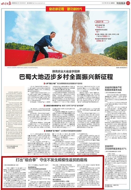 6月9日 ,《四川日报》5版刊发《打出“组合拳”守住不发生规模性返贫的底线》一文,从挂职又一次期满后,再次申请延期的凉山彝族自治州昭觉县三岔河镇三河村第一书记李凯的经历,从个例到普遍,聚焦9100万巴蜀儿女牢记嘱托,打出“组合拳”守住不发生规模性返贫的底线。