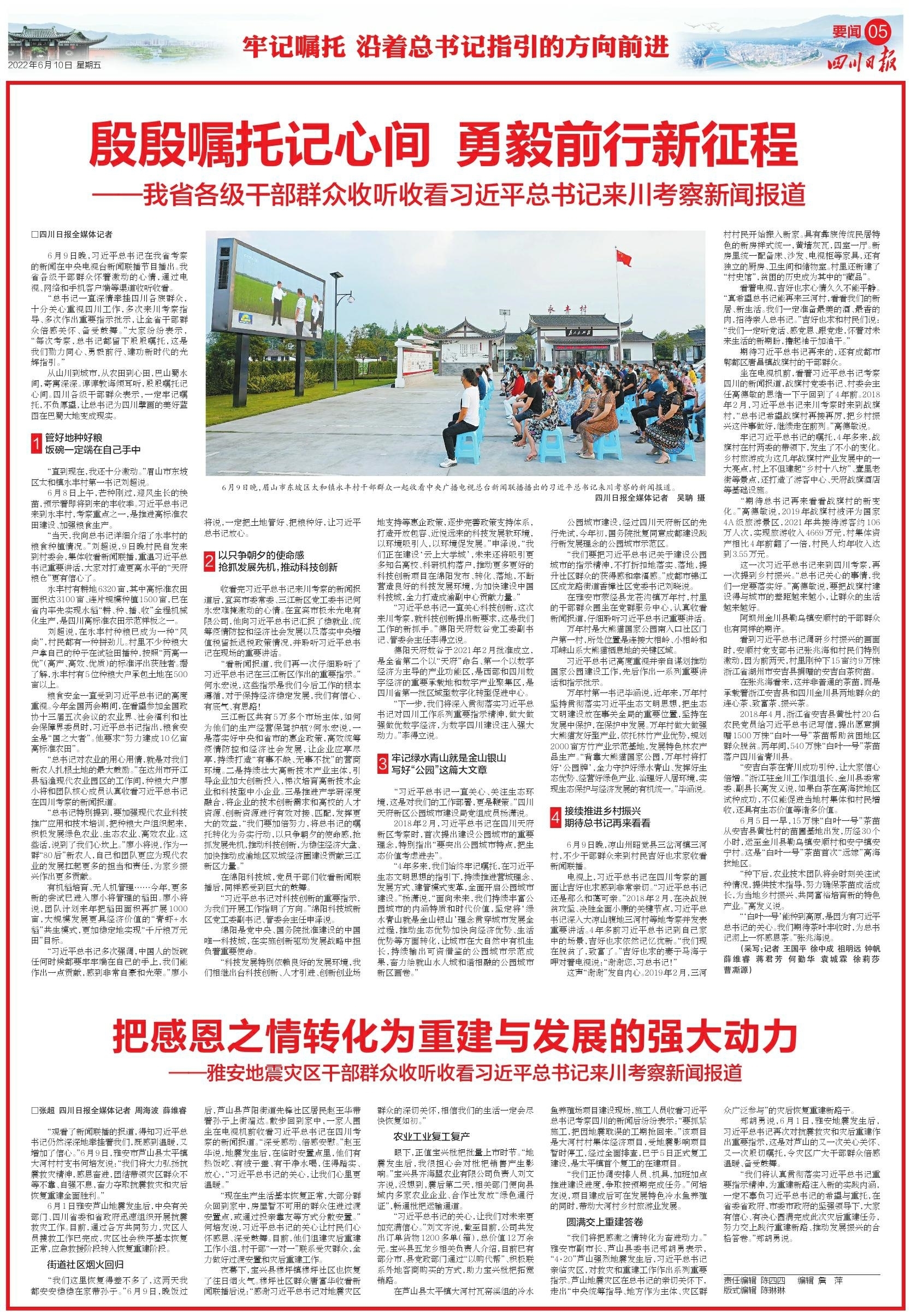6月10日,四川日报5版刊《殷殷嘱托记心间 勇毅前行新征程》,报道6月9日晚习近平总书记在我省考察的新闻在中央电视台新闻联播节目播出,凉山州昭觉县三岔河镇三河村干部群众怀着激动心情收看新闻联播,并纷纷表示听党话、感党恩、跟党走,怀着对未来生活的新期盼,撸起袖子加油干,期待总书记再来看看。