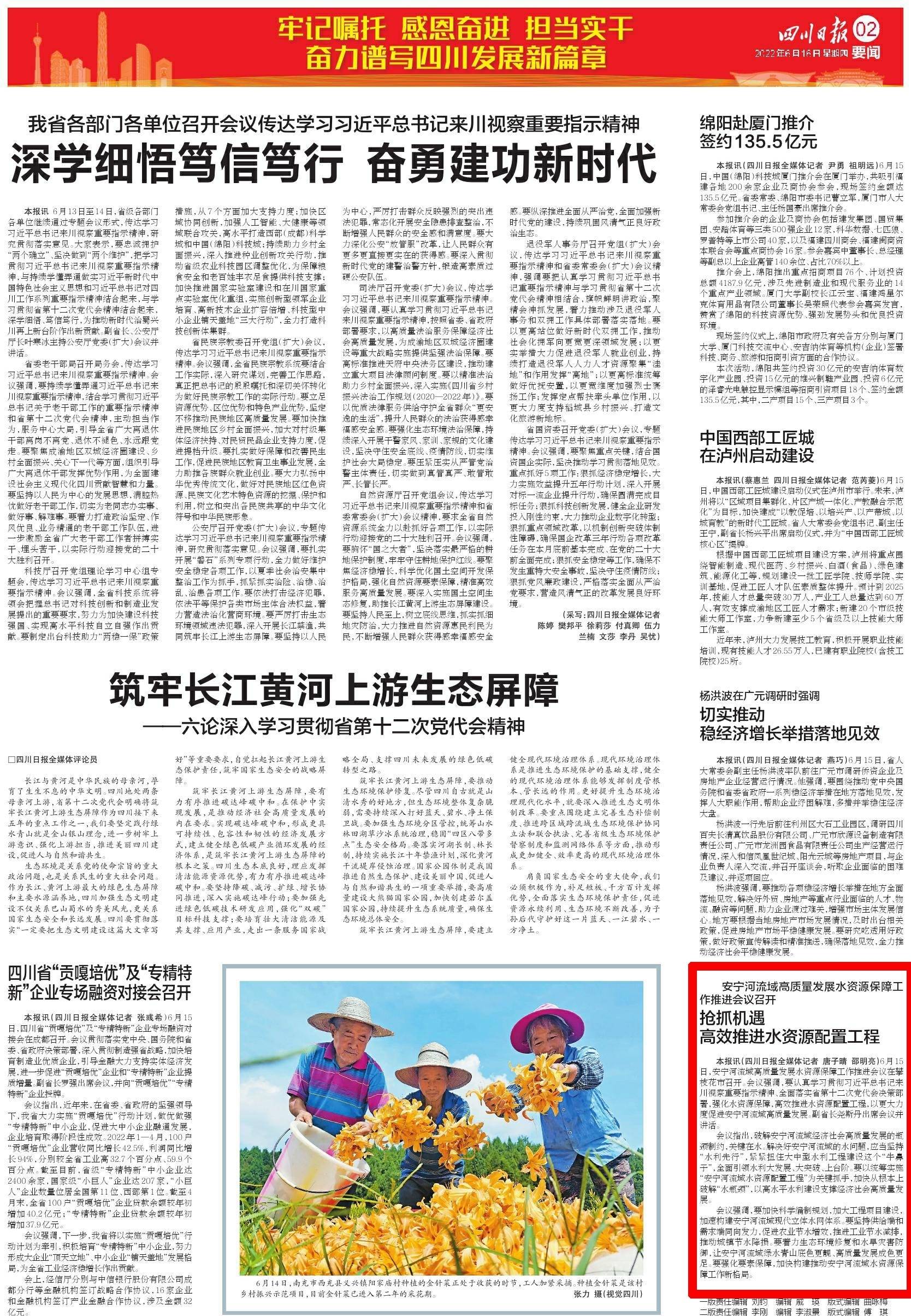 6月16日,《四川日报》2版刊《抢抓机遇高效推进水资源配置工程》一文,聚焦安宁河流域高质量发展水资源保障工作推进会议召开,会议指出要以统筹实施“安宁河流域水资源配置工程”为关键抓手,加快从根本上破解“水瓶颈”,以高水平水利建设支撑经济社会高质量发展。