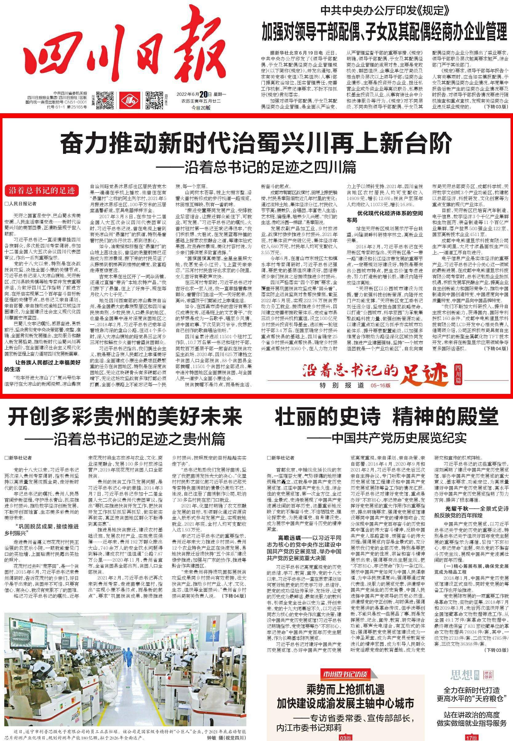 6月20日,《四川日报》1版刊发《奋力推动新时代治蜀兴川再上新台阶——沿着总书记的足迹之四川篇》文章,报道党的十八大以来,特别是在决战脱贫攻坚、决胜全面小康的关键节点,习近平总书记深入大凉山腹地、天府新区、汶川县映秀镇等地考察并发表重要讲话,为做好四川工作指明了前进方向,如今凉山大地新生活、新奋斗的起点上,接续推进乡村振兴。