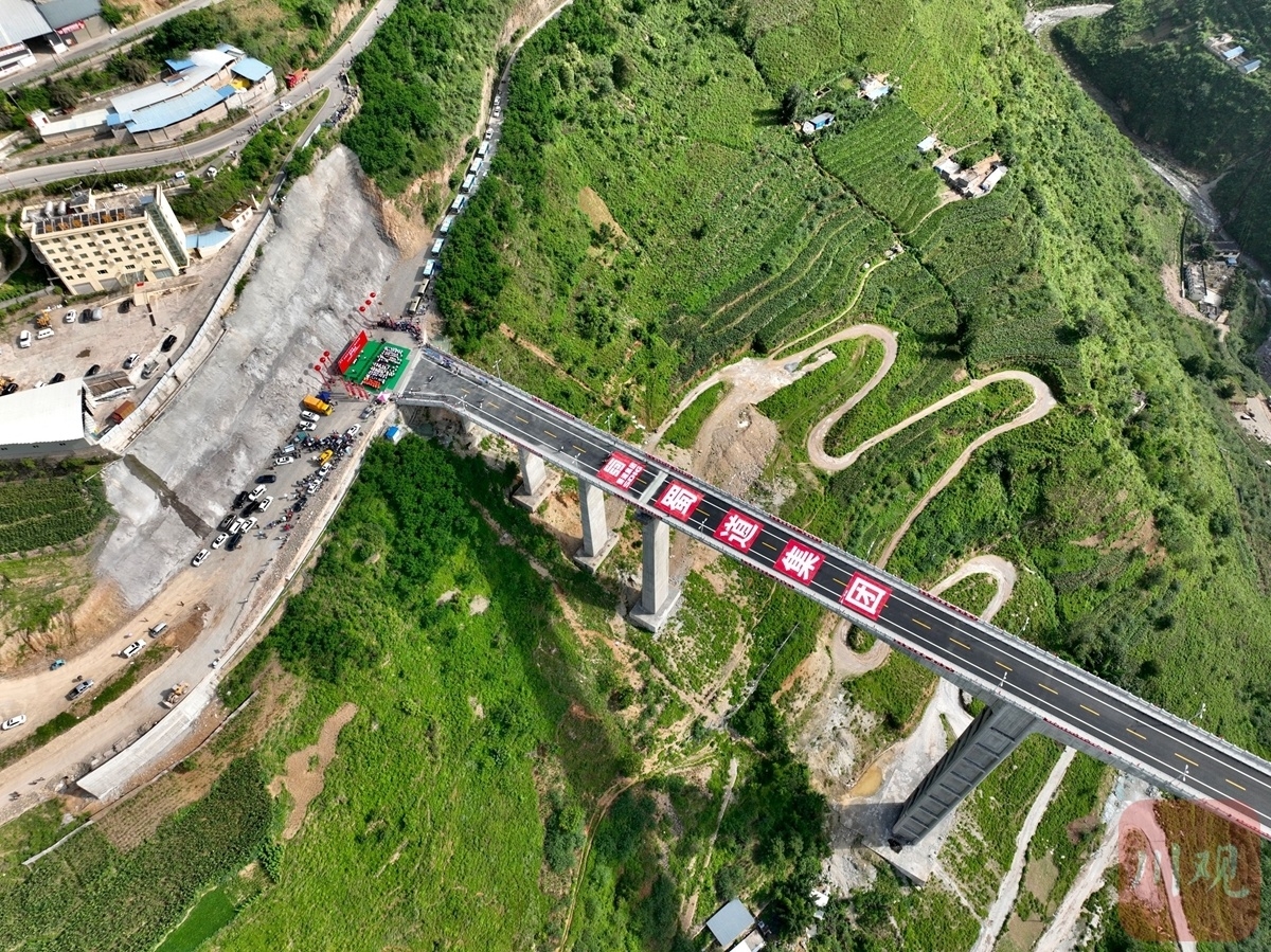 金阳河边,湛蓝的天空下,白云缭绕着青山绿水。高耸的群山之间,金阳河奔流不息,一座巍峨高桥如巨大卧龙雄踞其间、跨河衔山。