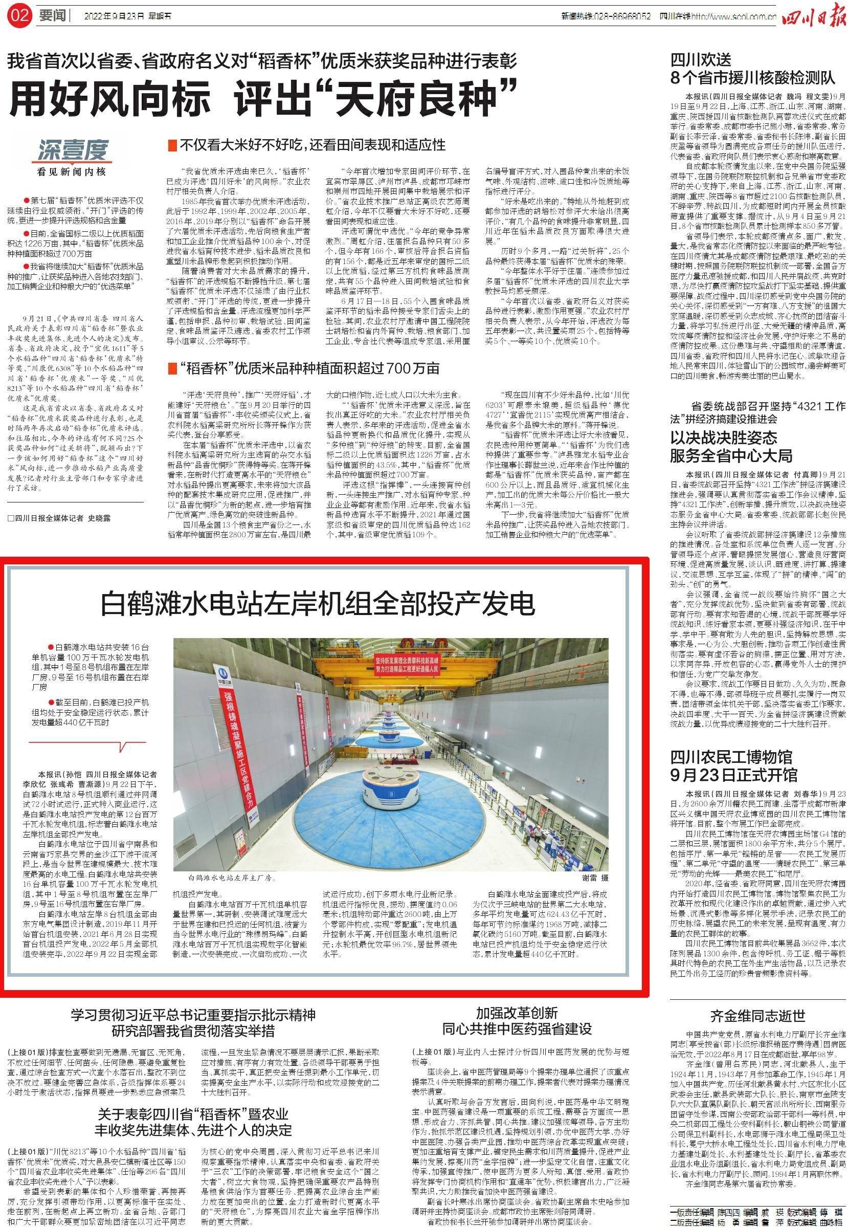 9月23日,《四川日报》2版刊发《白鹤滩水电站左岸机组全部投产发电》,关注9月22日下午白鹤滩水电站8号机组顺利通过并网调试72小时试运行,正式转入商业运行,这是白鹤滩水电站投产发电的第12台百万千瓦水轮发电机组,标志着白鹤滩水电站左岸机组全部投产发电。