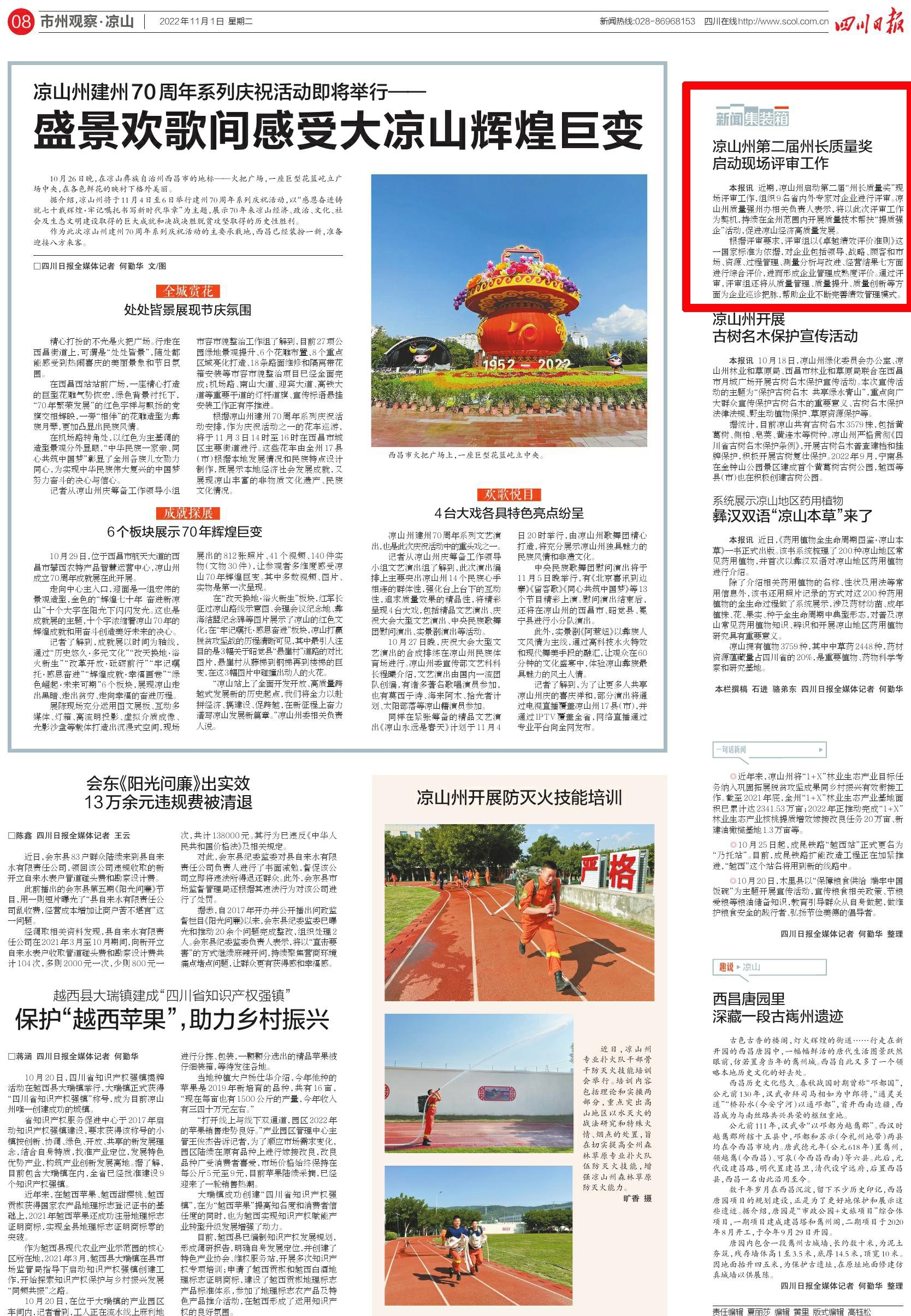 11月1日,《四川日报》08版刊发《凉山州第二届州长质量奖启动现场评审工作》,关注近期凉山州启动第二届“州长质量奖”现场评审工作,以此次评审工作为契机,持续在全州范围内开展质量技术帮扶“提质强企”活动,促进凉山经济高质量发展。