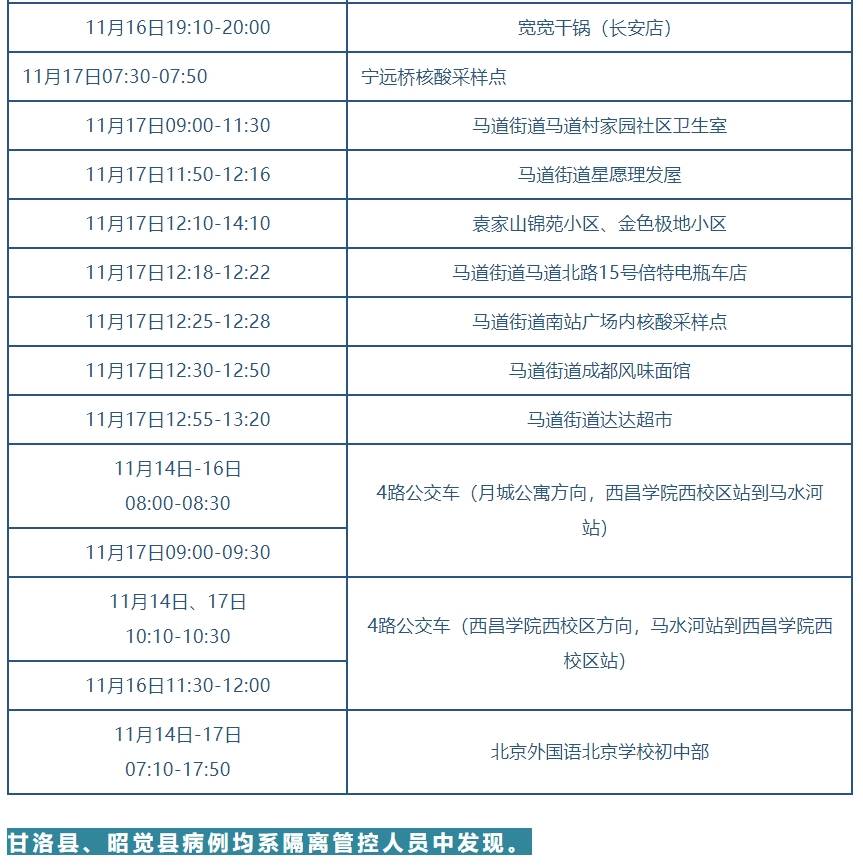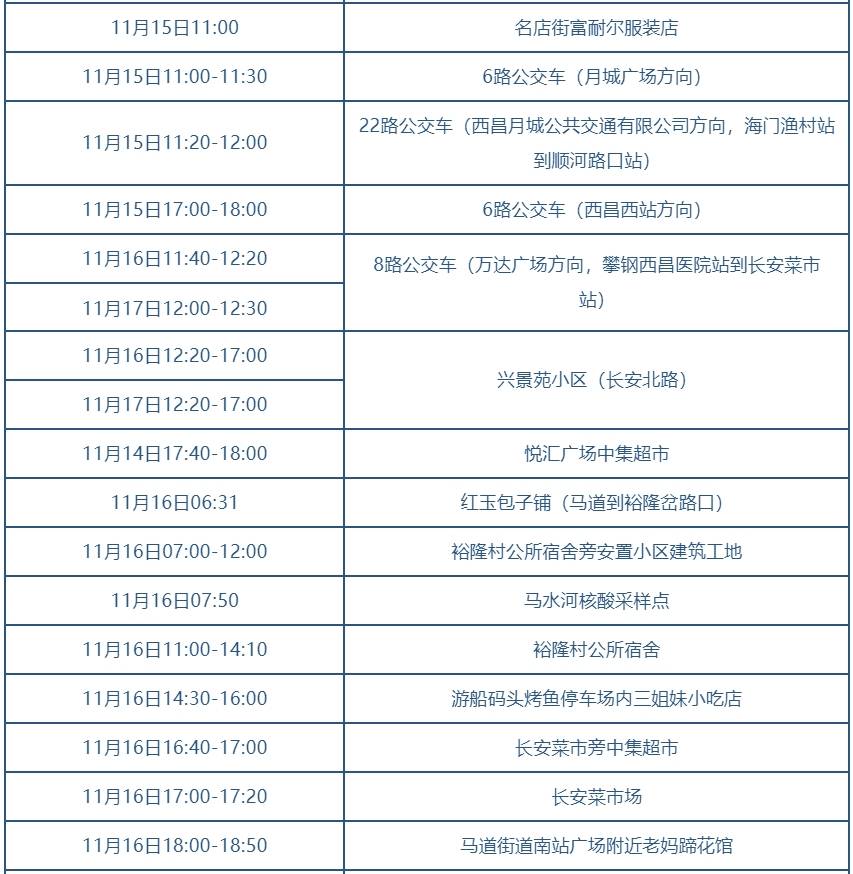 新增感染者轨迹现公布如下,如与以下活动轨迹有重叠,请第一时间向社区、单位(或居住酒店)报备,主动开展核酸检测,不聚集、不扎堆。加强自我防护,积极配合参与疫情防控工作,及时关注官方发布信息,做到不信谣、不传谣、不造谣。