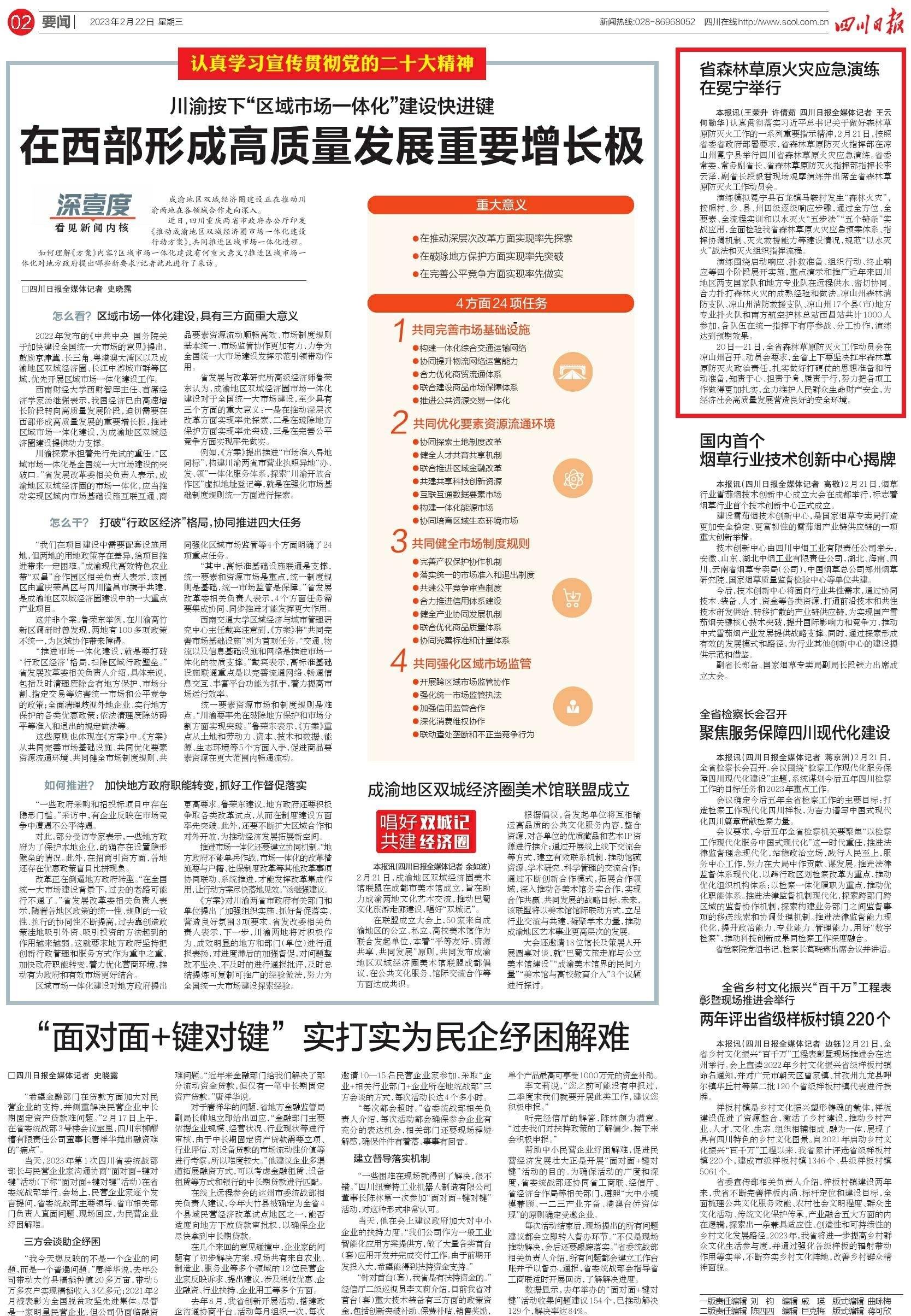 2月22日,四川日报2版刊发稿件《省森林草原火灾应急演练在冕宁举行》,关注省森林草原防灭火指挥部在凉山州冕宁县举行四川省森林草原火灾应急演练,全面检验我省森林草原火灾应急预案体系、指挥协调机制、灭火救援能力等建设情况,规范“以水灭火”战法和灭火组织指挥流程。