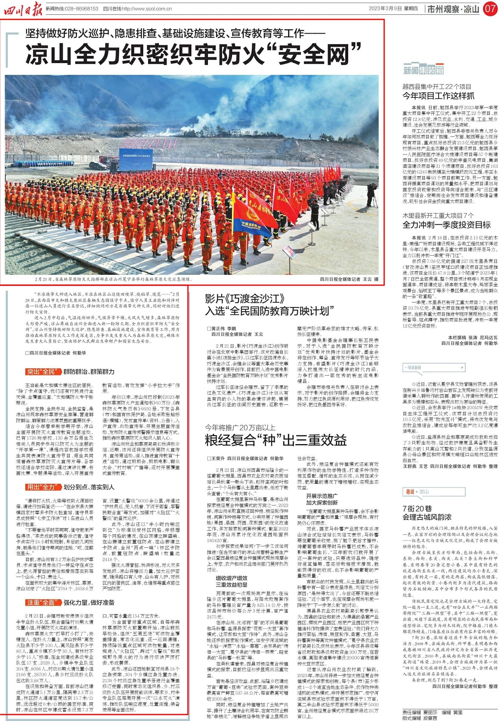 3月9日,《四川日报》刊发《凉山全力织密织牢防火“安全网”》文章,聚焦凉山坚持做好防火巡护、隐患排查、基础设施建设、宣传教育等工作,用力推动森林草原防灭火工作走深走实,力争不发生重大人为森林草原火灾,确保不发生重大人员伤亡,坚决维护人民群众生命财产和国家生态安全。