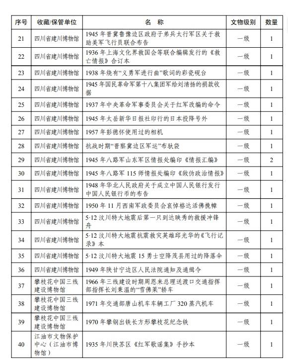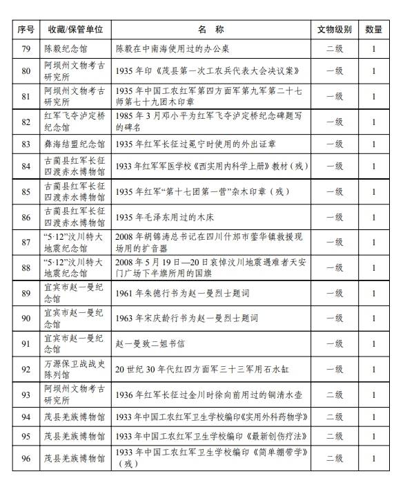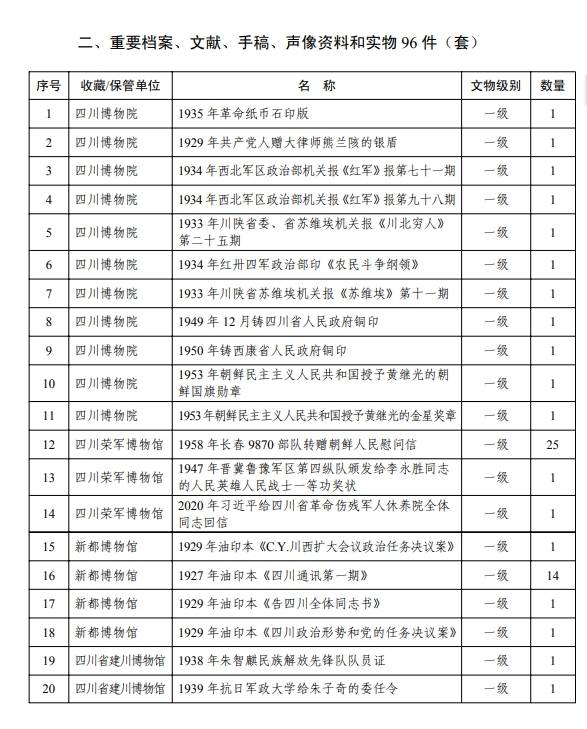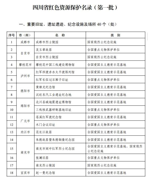 近日,四川省政府发布《四川省红色资源保护名录(第一批)》,纳入全省红色资源136个,包括成都市烈士陵园等重要旧址、遗址遗迹、纪念设施及场所40个(处),“1935年革命纸币石印版”等重要档案、文献、手稿、声像资料和实物96件(套)。