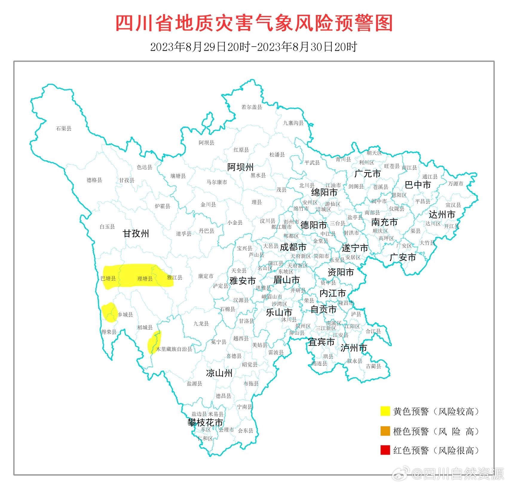根据四川省气象台天气预报情况,结合四川省地质环境条件,8月29日20时至8月30日20时,全省地质灾害气象风险预警结果如下: