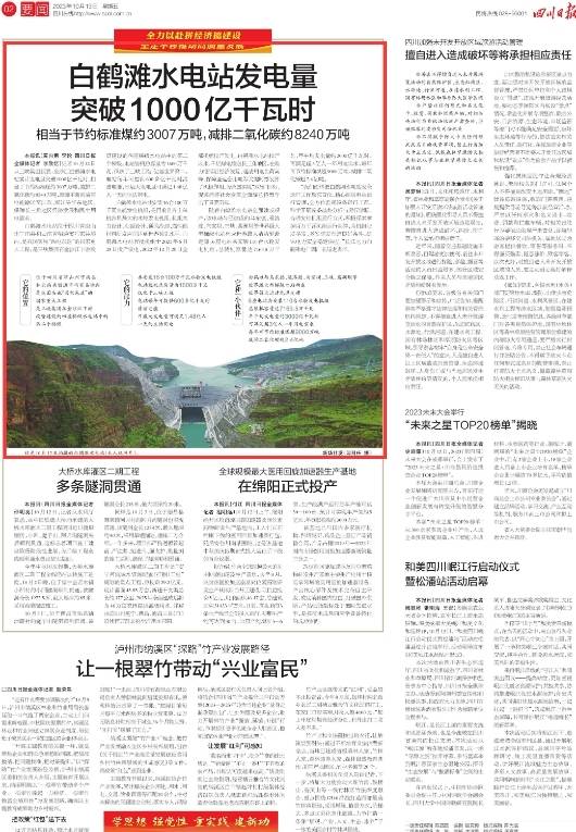 10月13日,《四川日报》刊发《白鹤滩水电站发电量突破 1000 亿千瓦时》文章,聚焦金沙江白鹤滩水电站累计发电量突破1000亿千瓦时,源源不断的清洁电能输送至江苏、浙江等华东地区,保障长三角地区经济发展和民生用电需求。