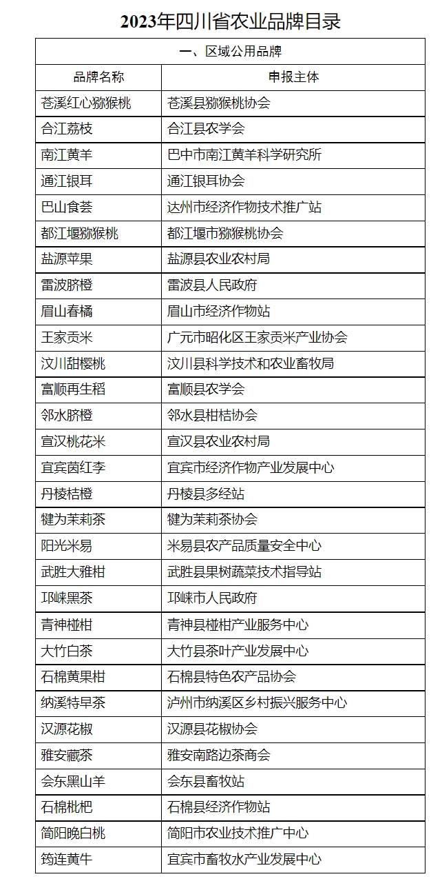 1月16日,四川省农业农村厅发布《关于公布2023年四川省农业品牌目录的通知》(以下简称“《通知》”),30个区域公用品牌、46个企业品牌,78个农产品品牌入选2023年四川省农业品牌目录。